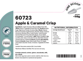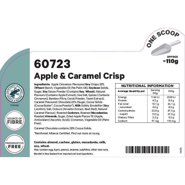 A delicious blend of sweet, cinnamon-coated almonds and cashews, with tasty, chewy dried apple pieces, macadamias, apple-infused soy snacks, and velvety caramel chocolate drops – an ode to a deconstructed Apple & Caramel Crumble but crispy.