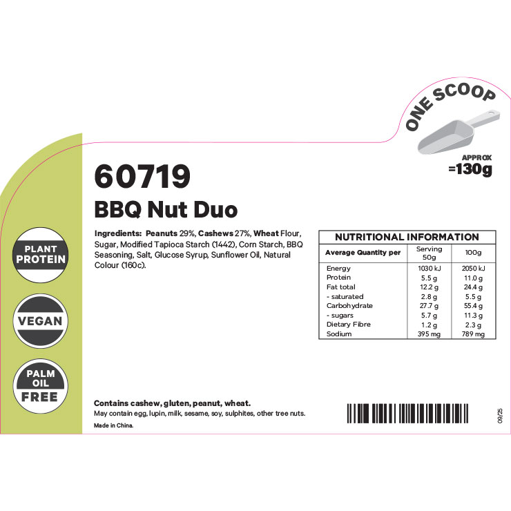 Roasted peanuts and cashews, coated in a crispy baked shell and loaded with irresistible BBQ flavour!