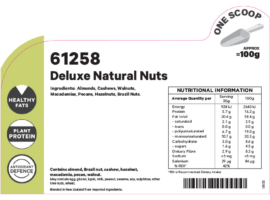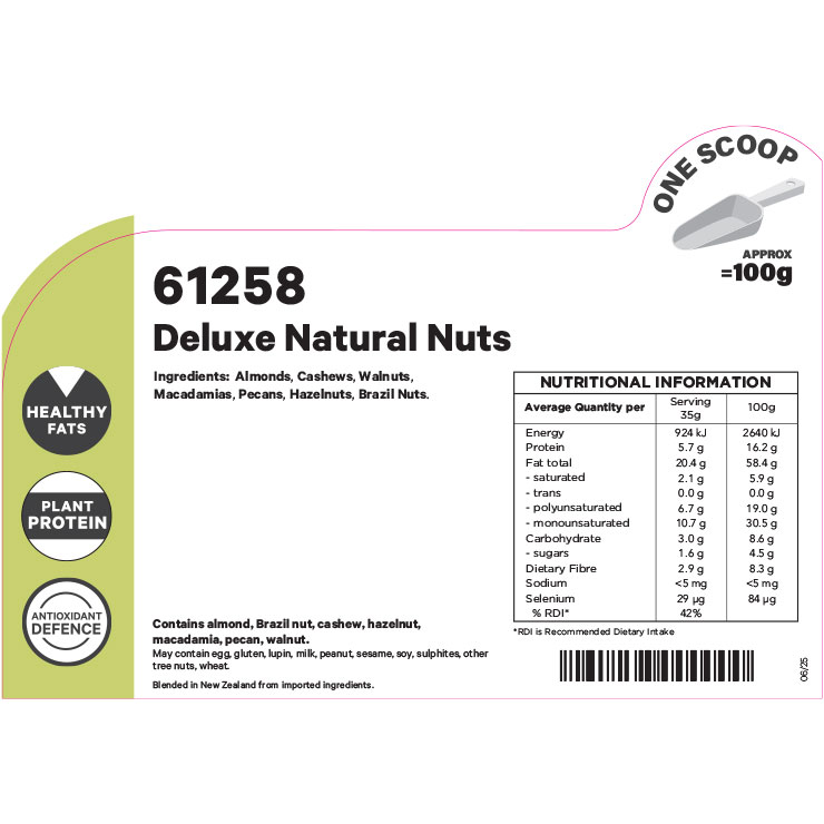 Contains almond, Brazil nut, cashew, hazelnut, macadamia, pecan, walnut. Product may contain: egg, gluten, lupin, milk, peanut, sesame, soy, sulphites, tree nuts and wheat.