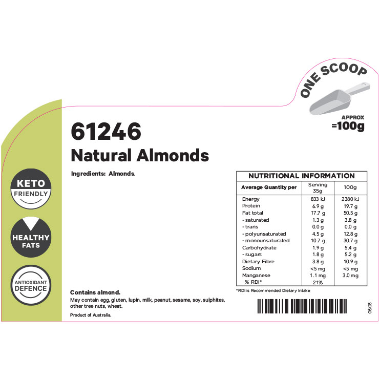 Contains almond. Product may contain: egg, gluten, lupin, milk, peanut, sesame, soy, sulphites, tree nuts and wheat.