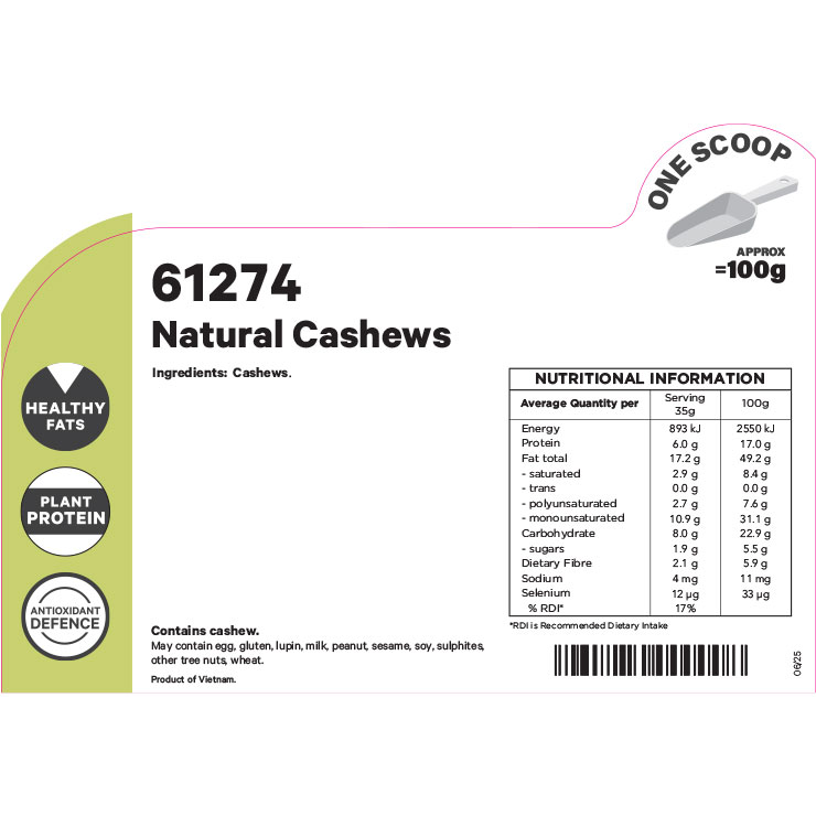 Contains cashew. Product may contain: egg, gluten, lupin, milk, peanut, sesame, soy, sulphites, tree nuts and wheat.