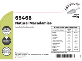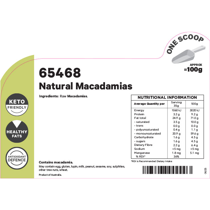 Contains macadamia. Product may contain: egg, gluten, lupin, milk, peanut, sesame, soy, sulphites, tree nuts and wheat.