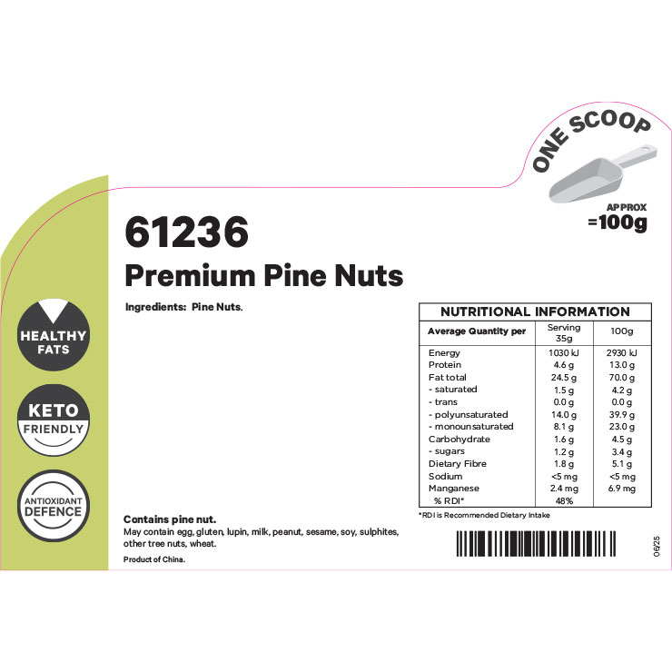 Contains pine nut. Product may contain: egg, gluten, lupin, milk, peanut, sesame, soy, sulphites, tree nuts and wheat.