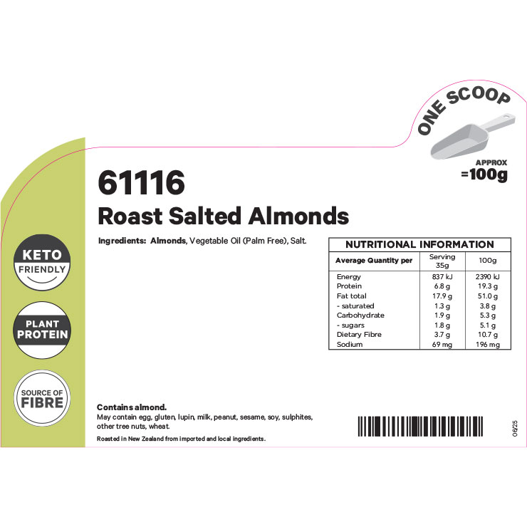 Almonds batch roasted in high oleic sunflower oil, and lightly salted
