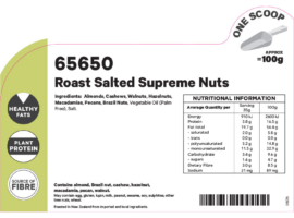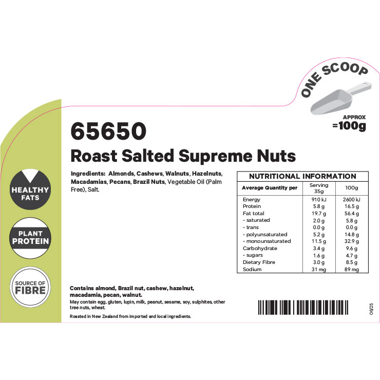 Premium roasted nut mix; almonds, cashews, hazelnuts, macadamias, brazil nuts and pecans. Lightly salted