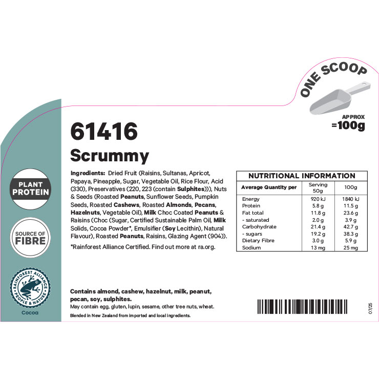Contains almond, cashew, hazelnut, milk, peanut, pecan, sulphites. Product may contain: egg, gluten, lupin, milk, peanut, sesame, soy, sulphites, tree nuts and wheat.
