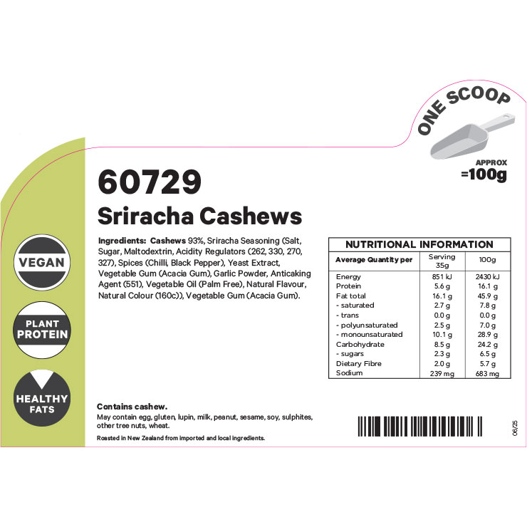 Turn up the heat with our new Sriracha Cashews — crunchy, roasted cashews coated in bold, fiery Sriracha seasoning. Packed with flavour, they’re the ultimate snack.