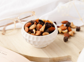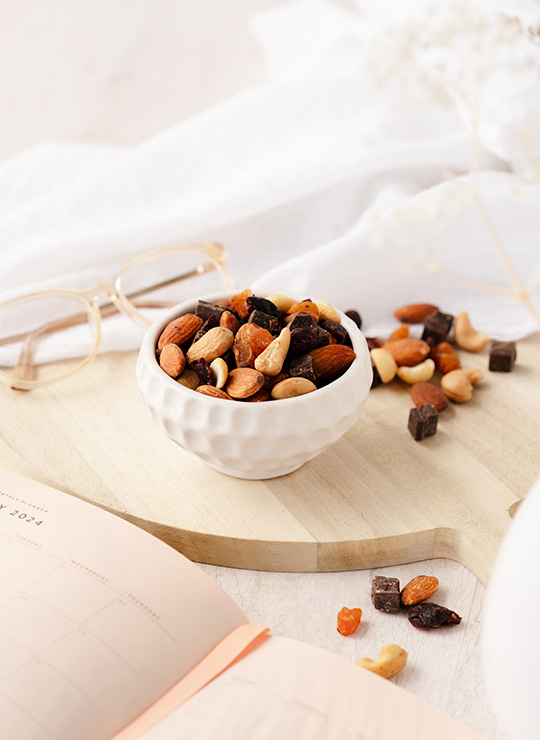 Orange Flavoured Cranberries (Cranberries, Sugar, Natural Flavour, Vegetable Oil (Palm Free)), Roast Almonds (Almonds, Vegetable Oil (Palm Free)), Golden Raisins (Raisins, Vegetable Oil (Palm Free), Preservative (220 (contains Sulphites))), Dark Chocolate (Cocoa Solids (Cocoa Mass*, Cocoa Butter*), Sugar, Emulsifier (Lecithin), Natural Flavour (contains Milk)), Roast Cashews (Cashews, Vegetable Oil (Palm Free)), Diced Dried Apricots (Apricots, Rice Flour, Preservative (220 (contains Sulphites))), Roast Macadamias. Dark chocolate contains 54% cocoa solids. May contain apricot pits.